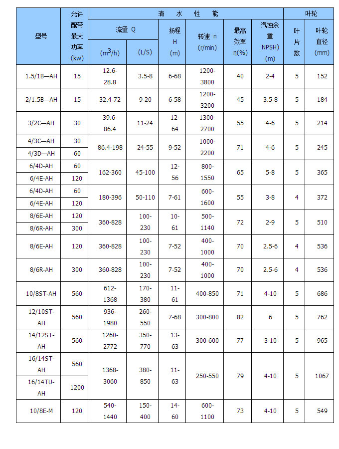 2. AH、ZGB亦可稱為重型渣漿泵。由于該型泵具有較厚的承磨件并配重型托架,故適于輸送強(qiáng)磨蝕、高濃度渣漿或低濃度高揚(yáng)程渣漿,在泵的*大允許工作壓力范圍內(nèi),可以多級(jí)串聯(lián)使用。其中ZGB型泵適用于輸送低濃度高揚(yáng)程渣漿或高濃度低磨蝕的高揚(yáng)程渣漿。以上幾種型式的泵亦可用于低腐蝕性渣漿。
